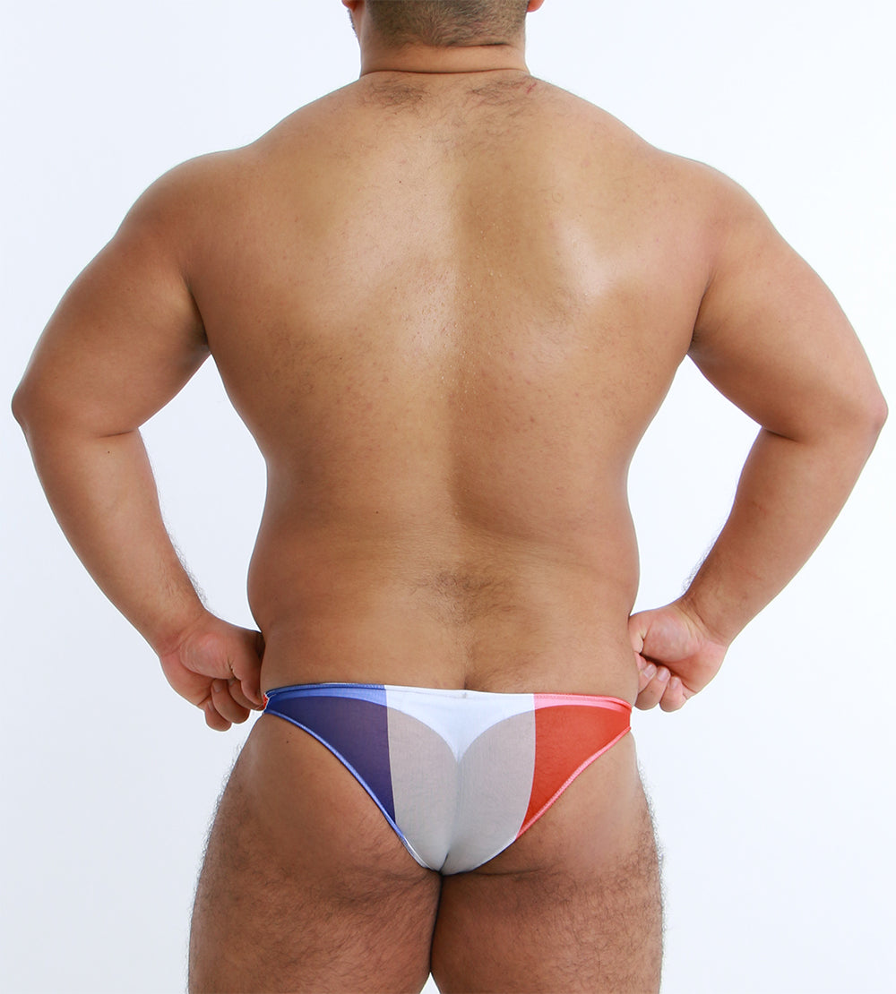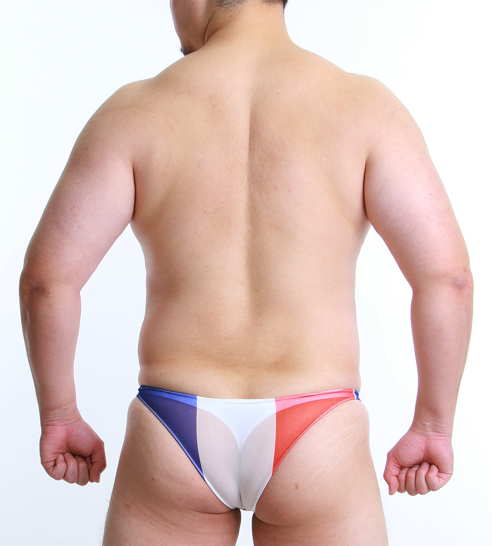 国旗モチーフを大胆にあしらった、存在感のあるメンズビキニ。