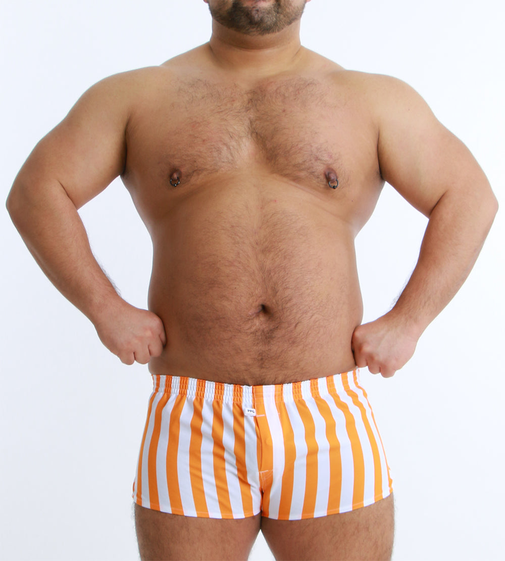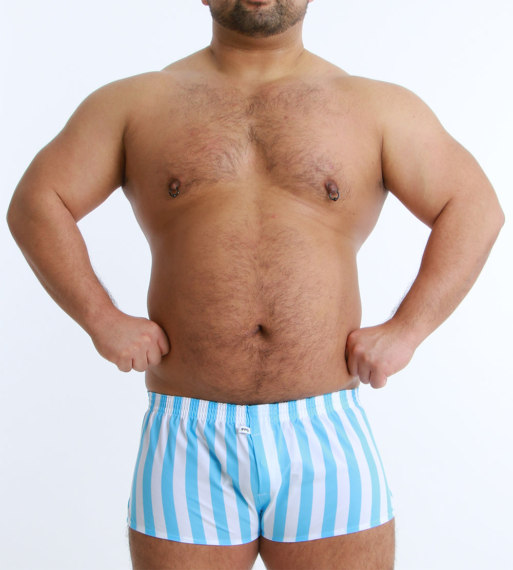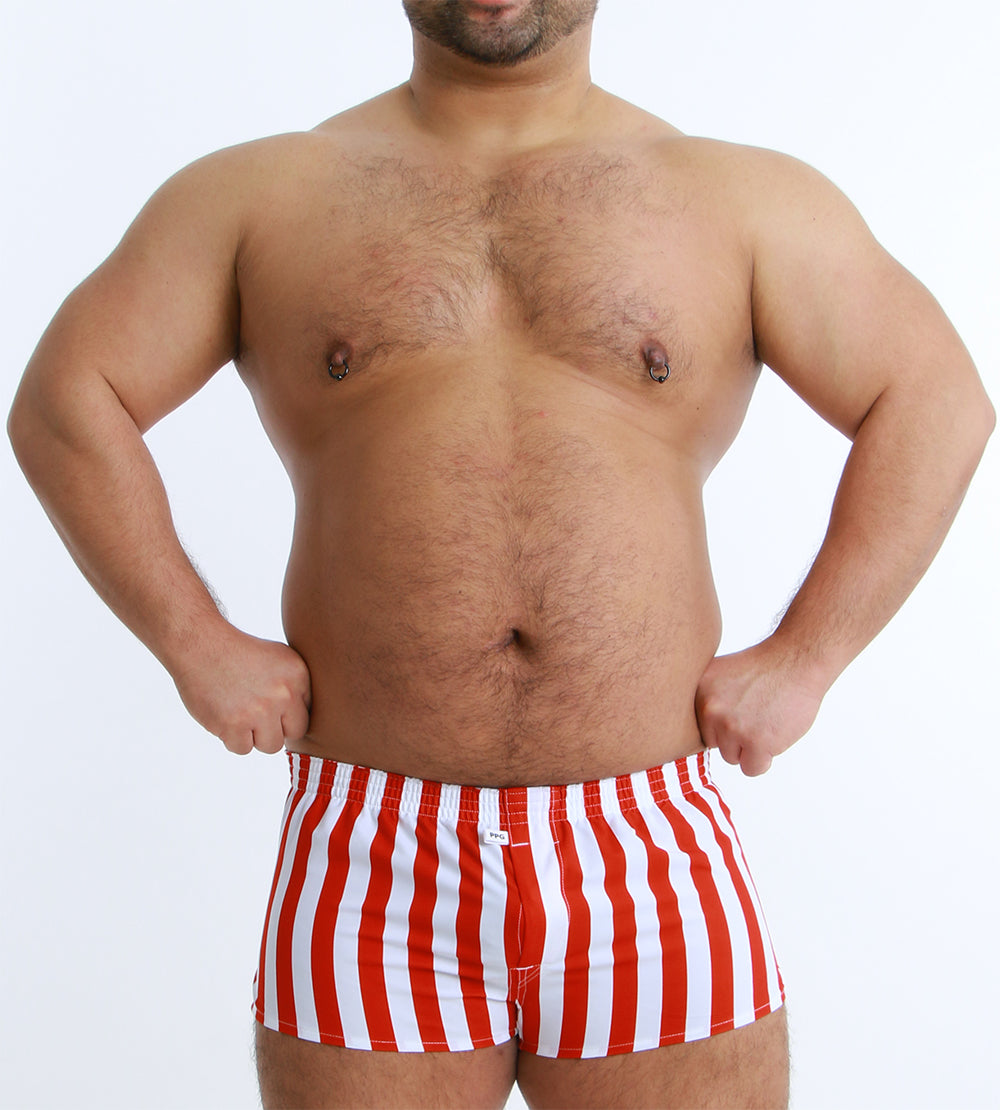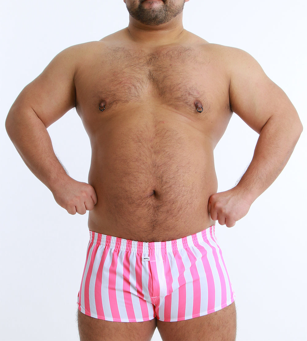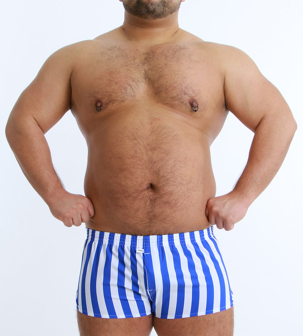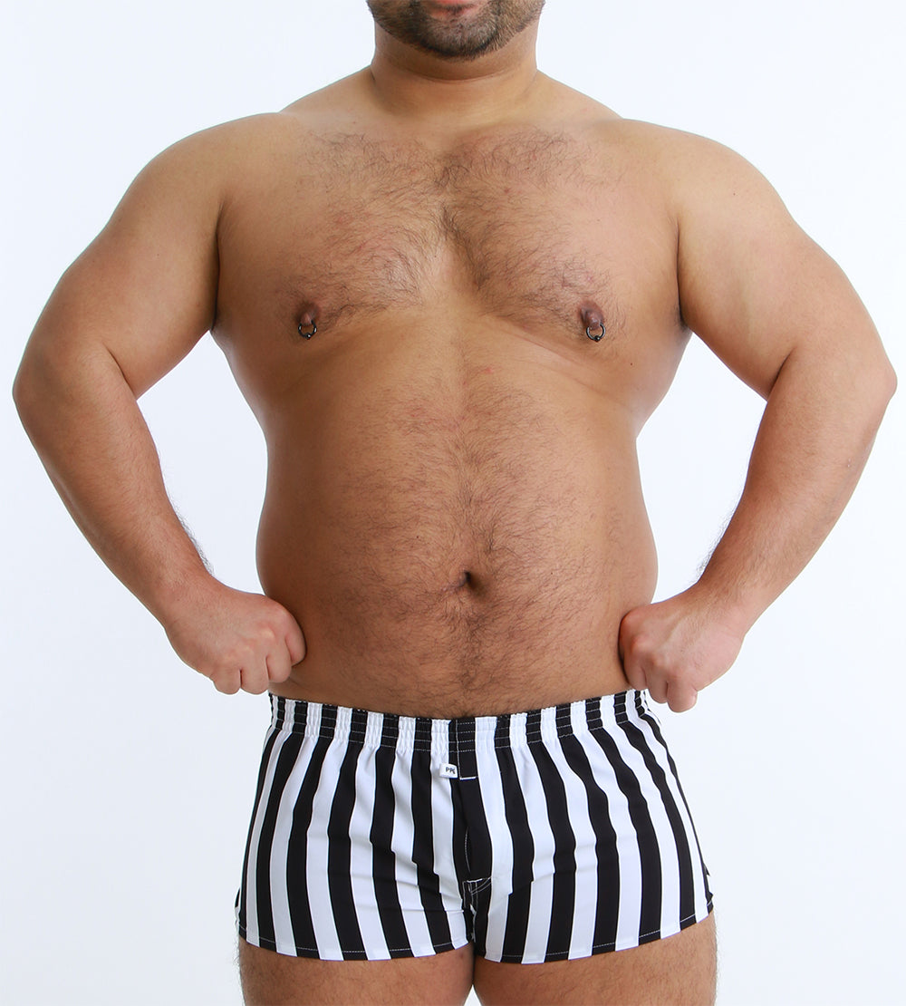 大胆なワイドストライプが目を引く、スタイリッシュなショート丈トランクス。