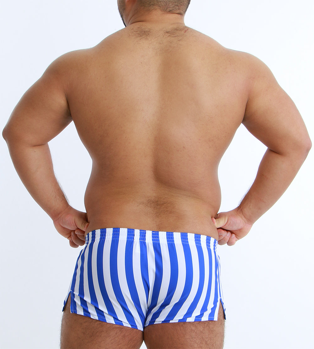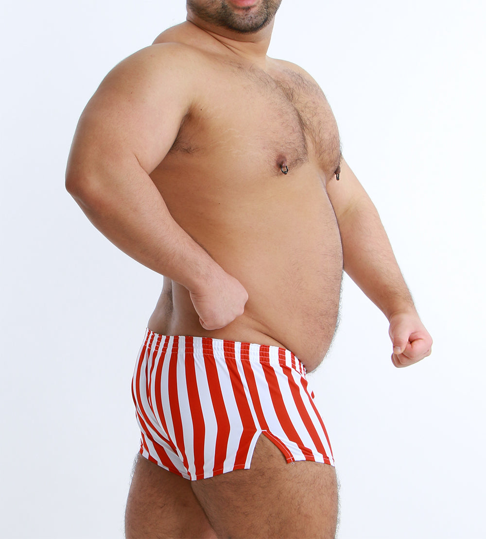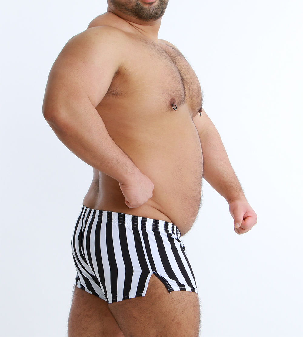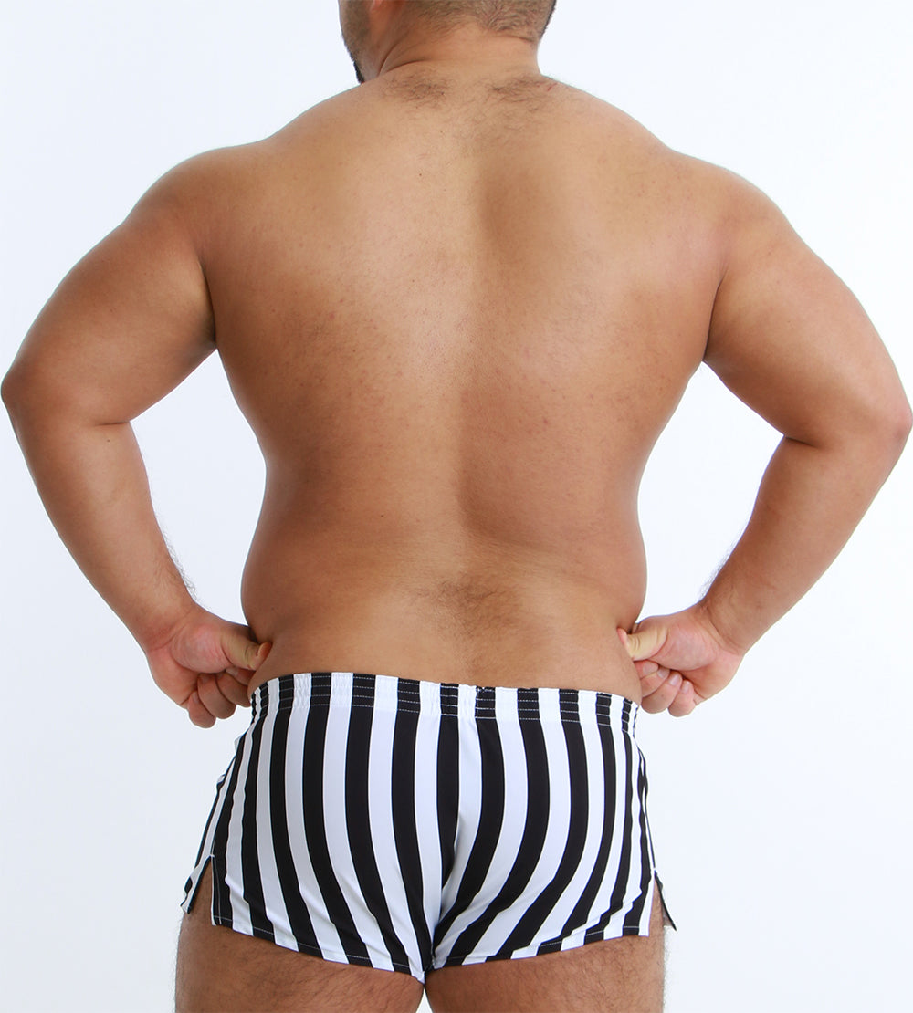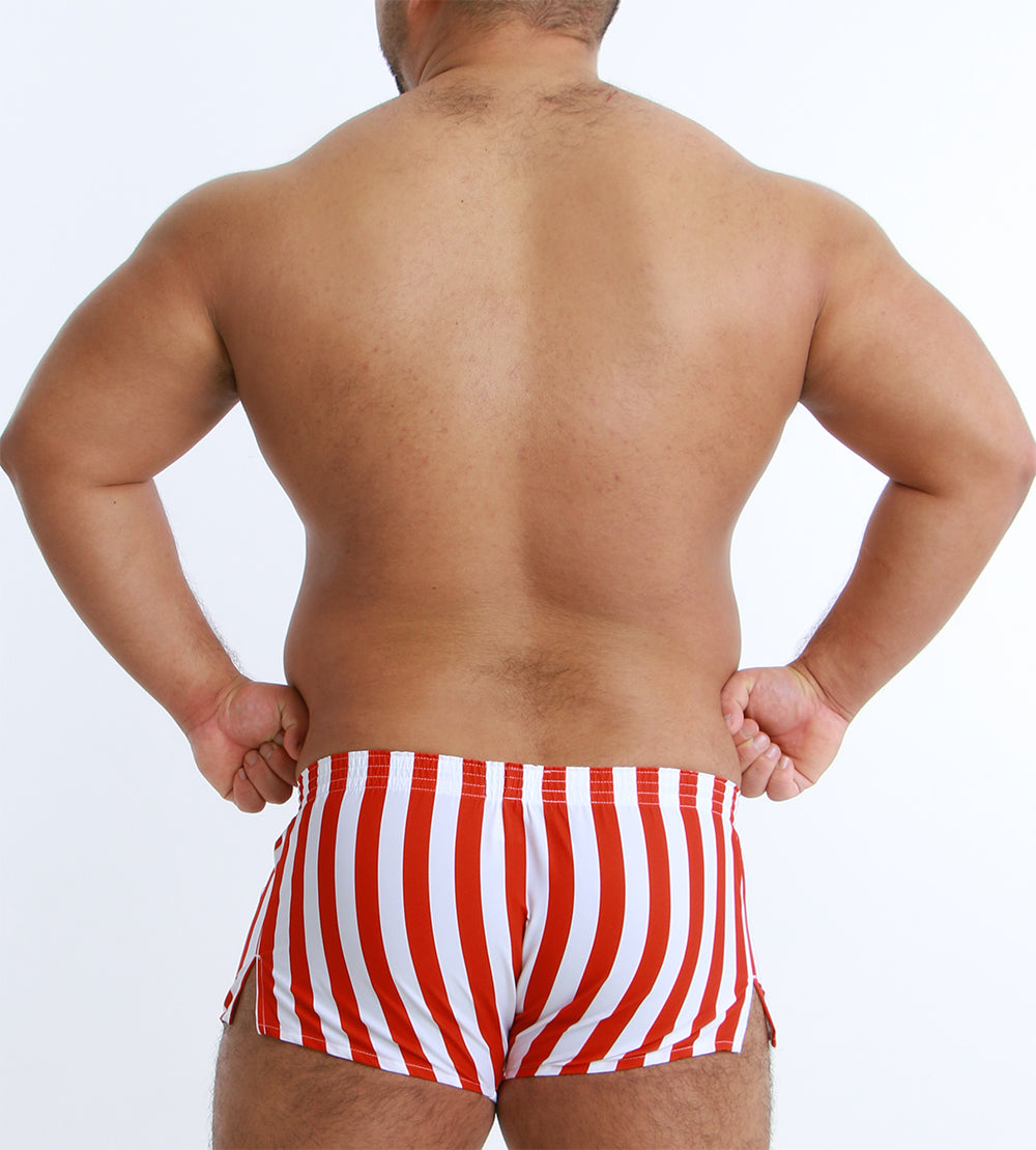 大胆なワイドストライプが目を引く、スタイリッシュなショート丈トランクス。