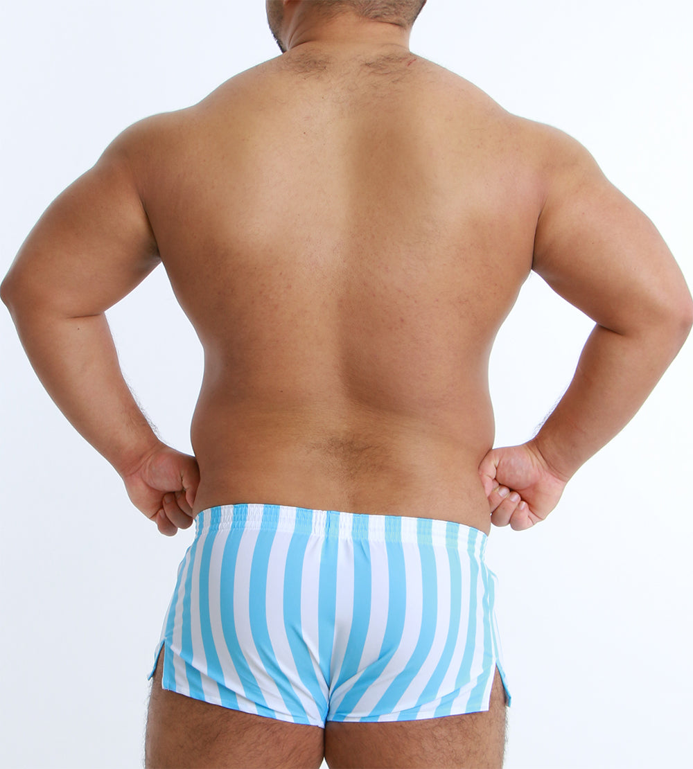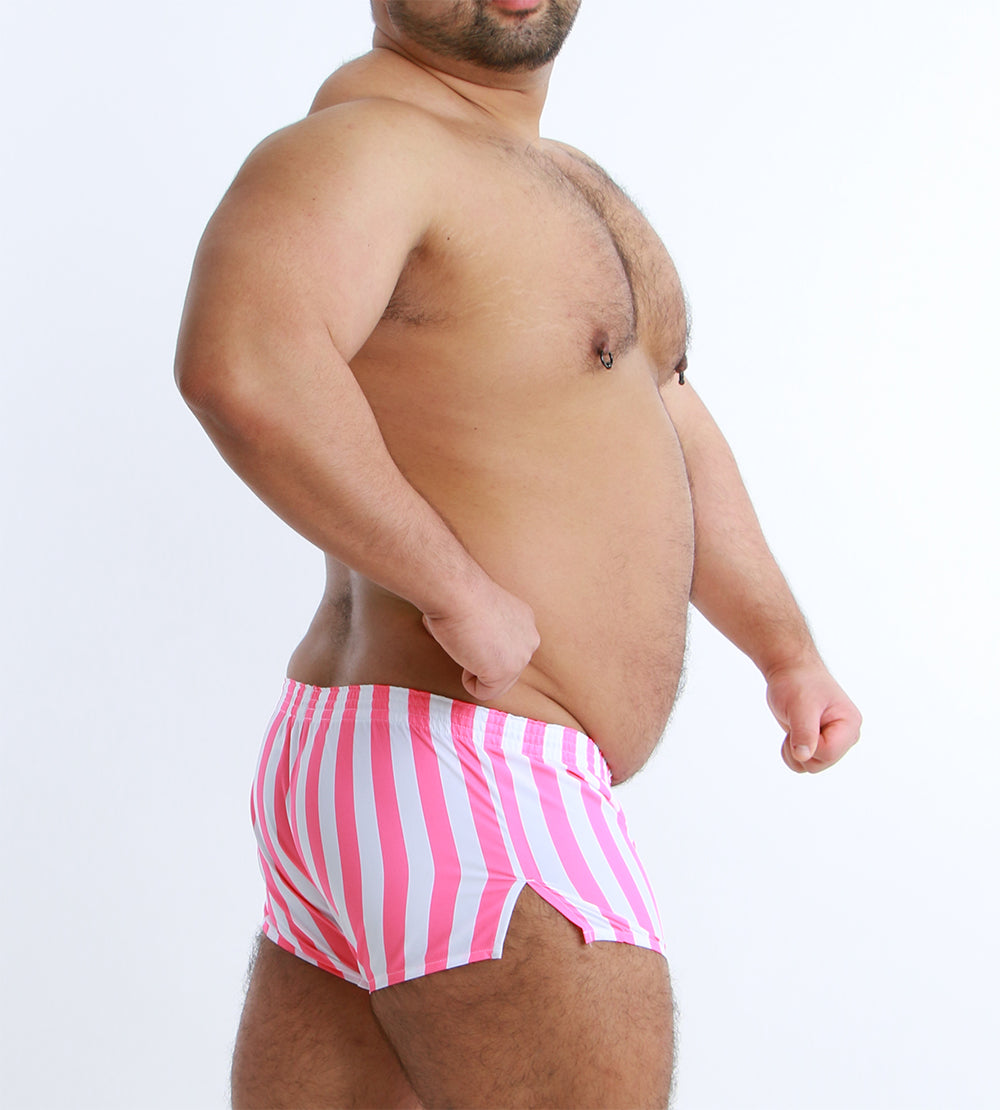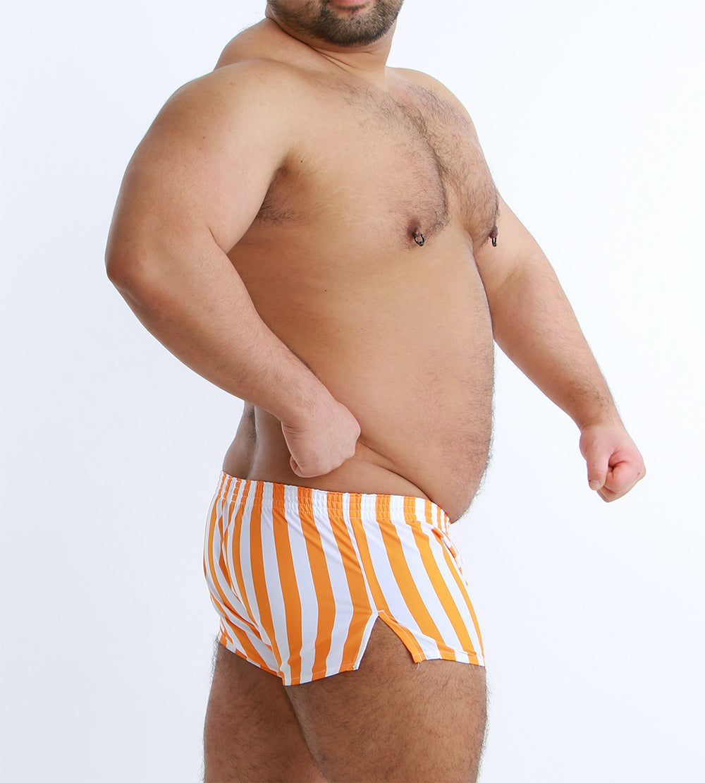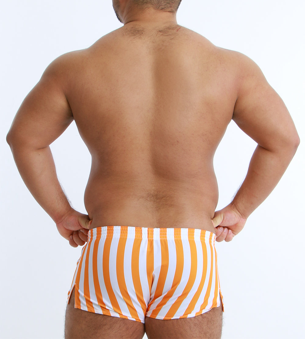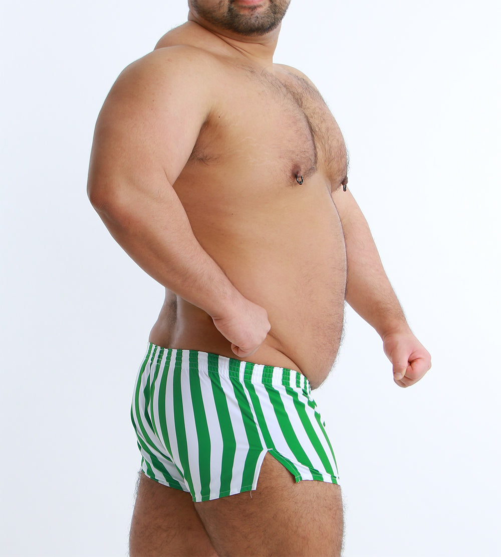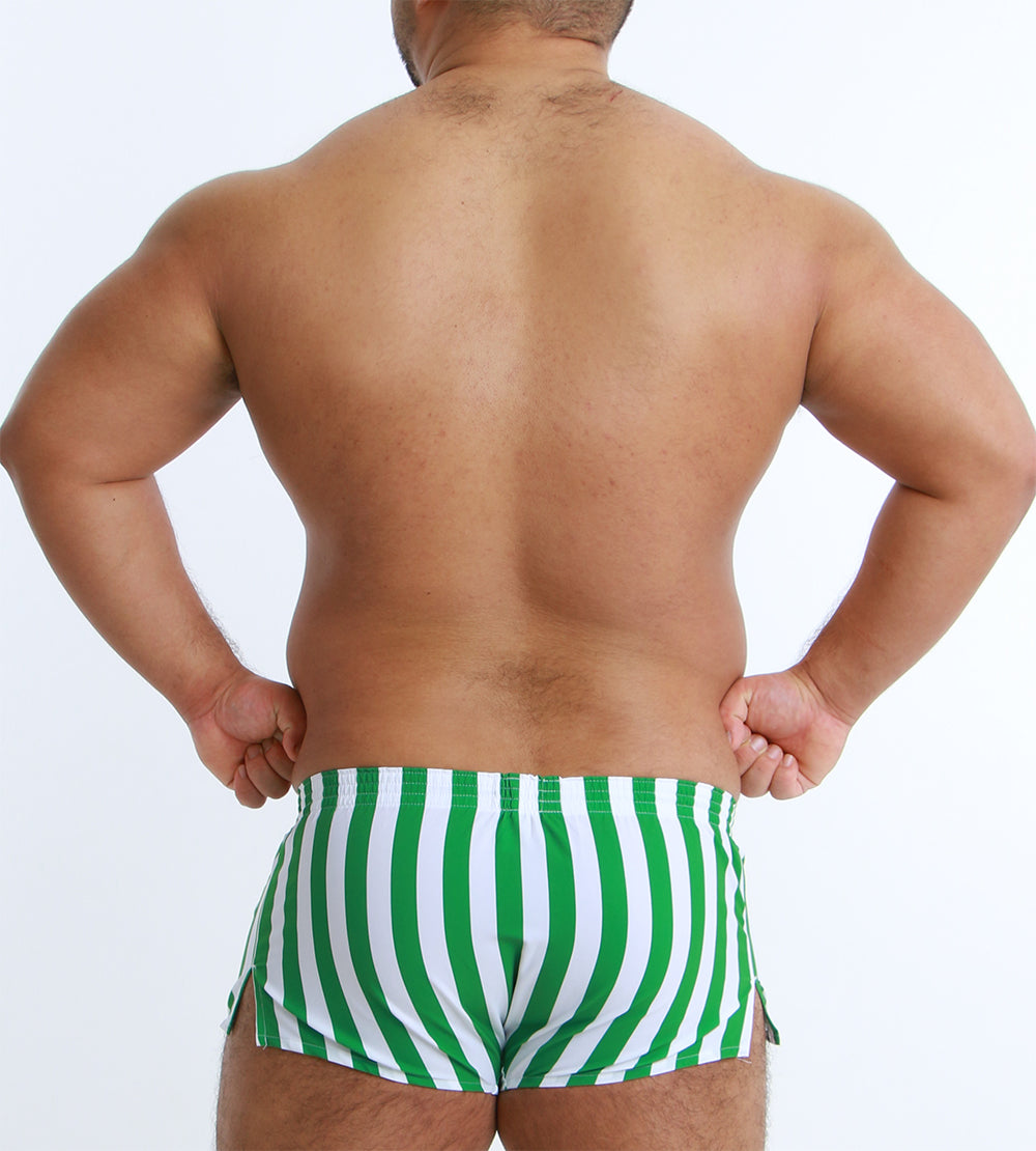 大胆なワイドストライプが目を引く、スタイリッシュなショート丈トランクス。